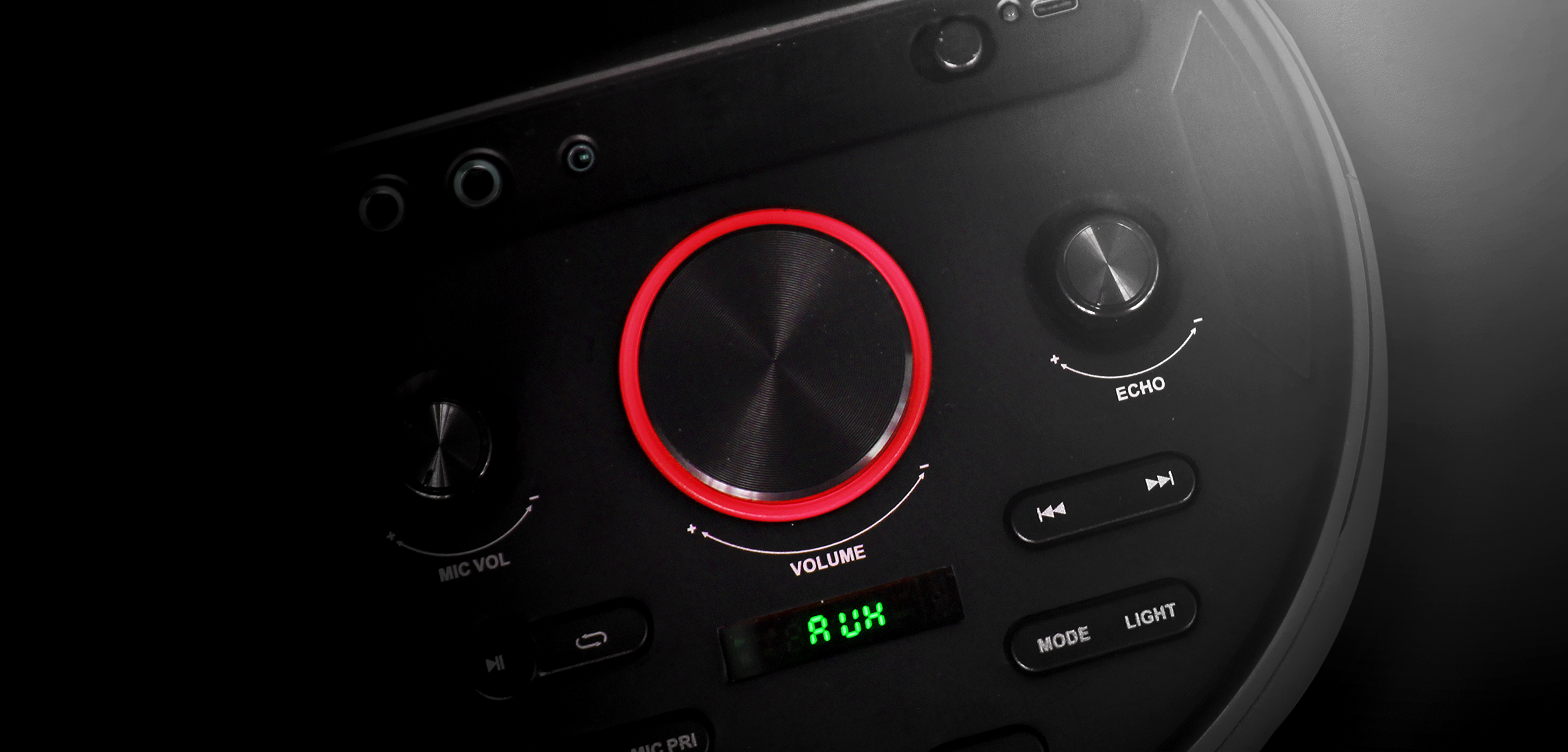 Its two essential 6.5" woofers with red LED rings and one 1" tweeters perfectly enhance both bass and treble sounds, respectively. It also offers an auxiliary input.