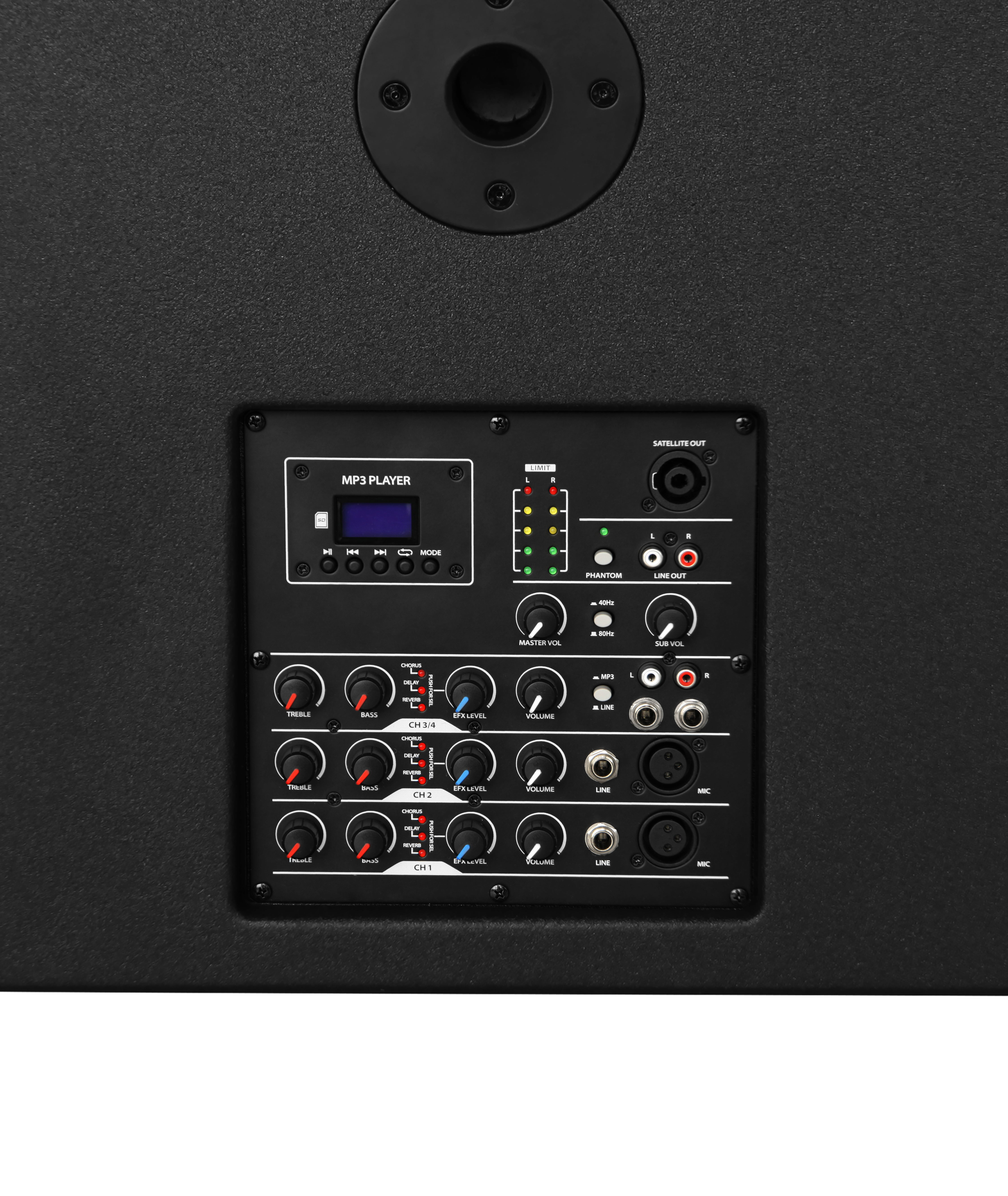 - Channel 3/4: 6.35mm Line Input + MP3 RCA Input