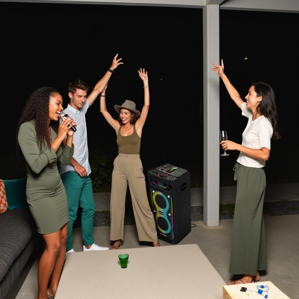 Delivers a peak power of 3000W PMPO and 200W RMS of true output, ensuring clear, powerful audio with strong presence in any setting. Dynamic LED lighting syncs with your music, and the microphone input includes voice effects such as echo, reverb, and pitch shift—perfect for unforgettable karaoke sessions.