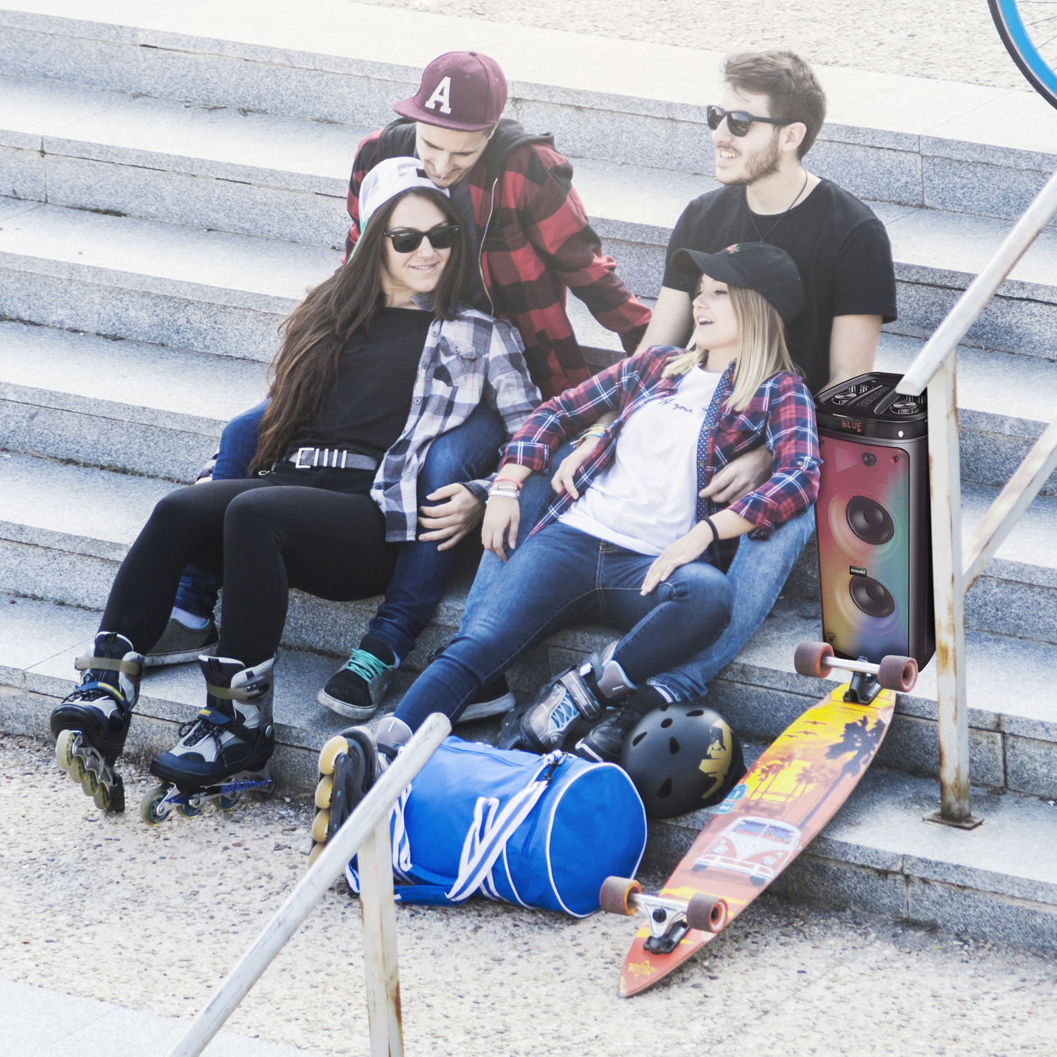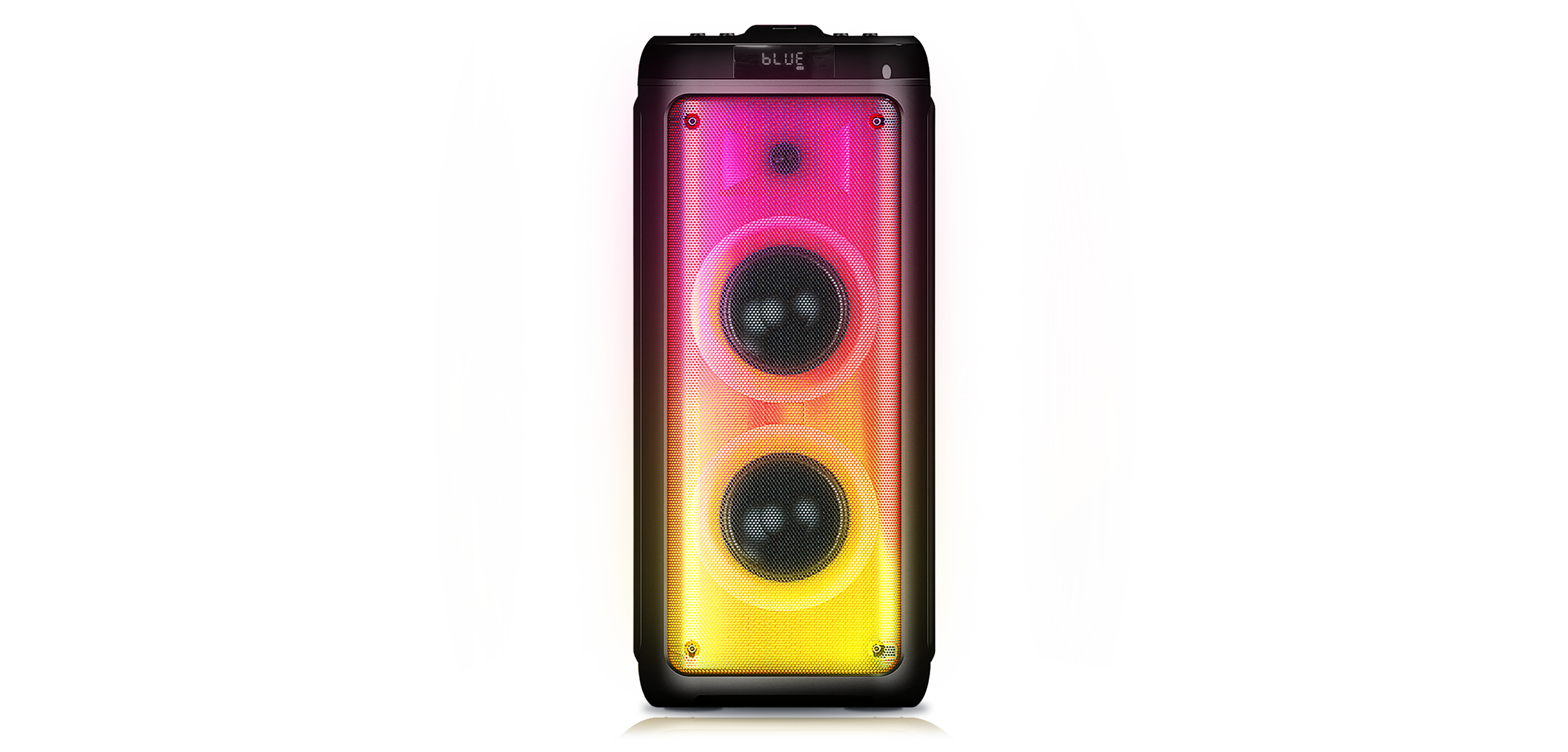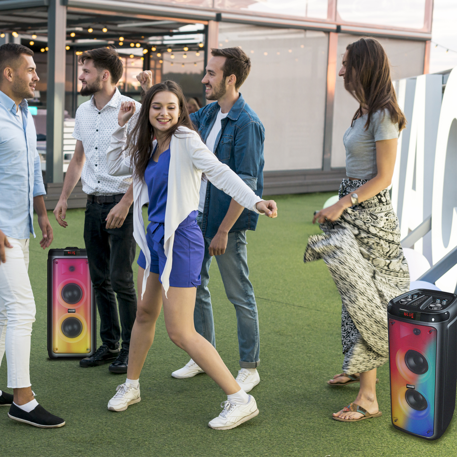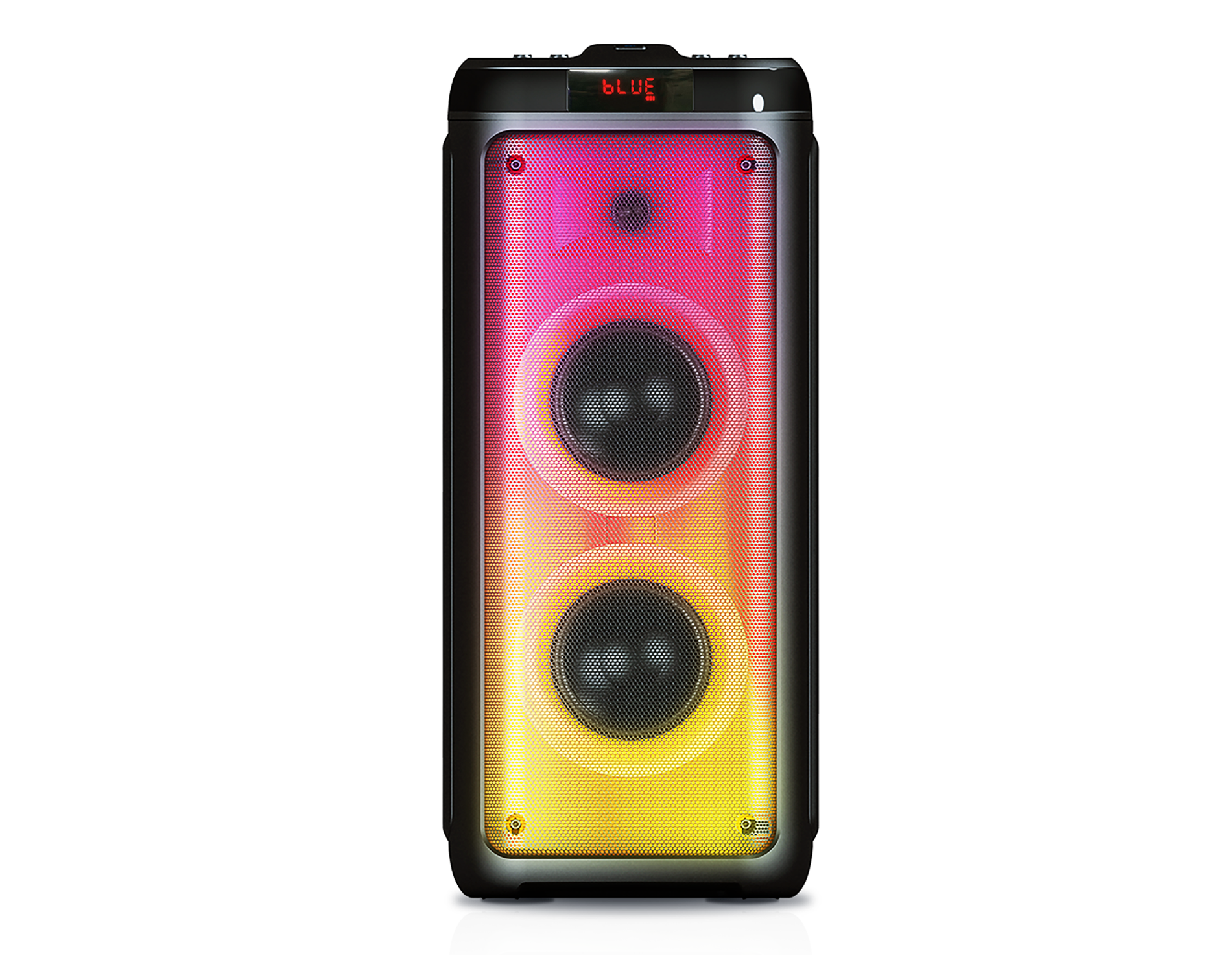 From the Party Speakers line, it has unique features: dual microphone inputs suitable for karaoke, LED lights, battery autonomy, portability, and excellent sound power and quality, making it perfect for parties and social gatherings.