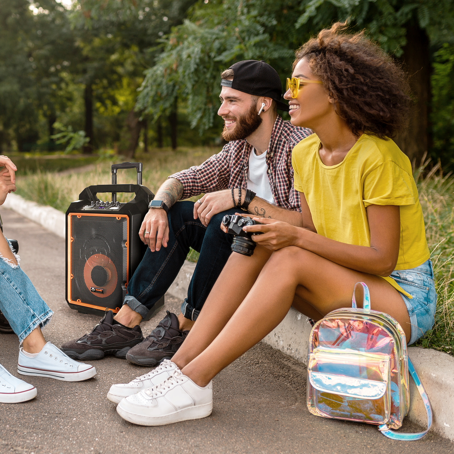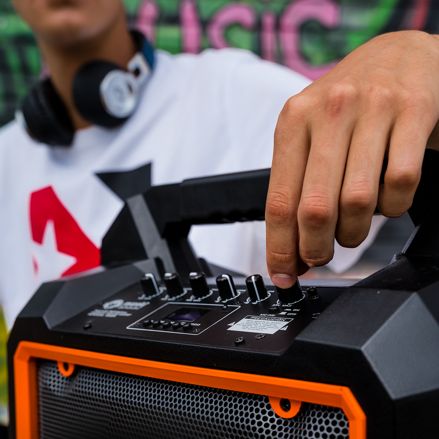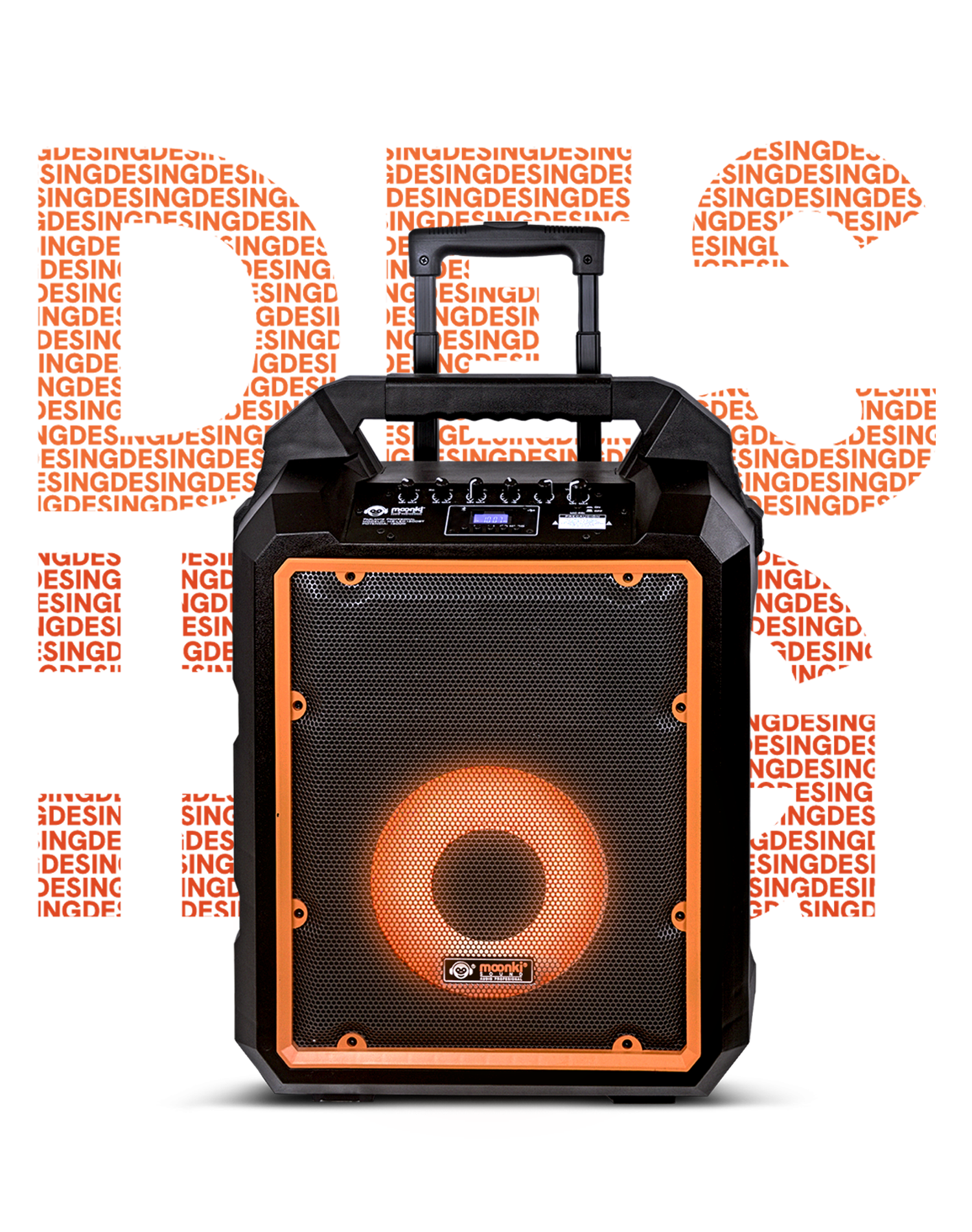 Its class AB amplifier plate provides the sound quality and clarity typical of a semi-professional speaker, while the sound power of 1200W PMPO (80W RMS) sets the perfect conditions for it to stand out among others of its class. These must-have features are complemented by its easily portable design, with a grip handle and retractable handle. Additionally, it includes a metallic wired microphone and a microphone priority function, so you can test your voice whenever you wish.
