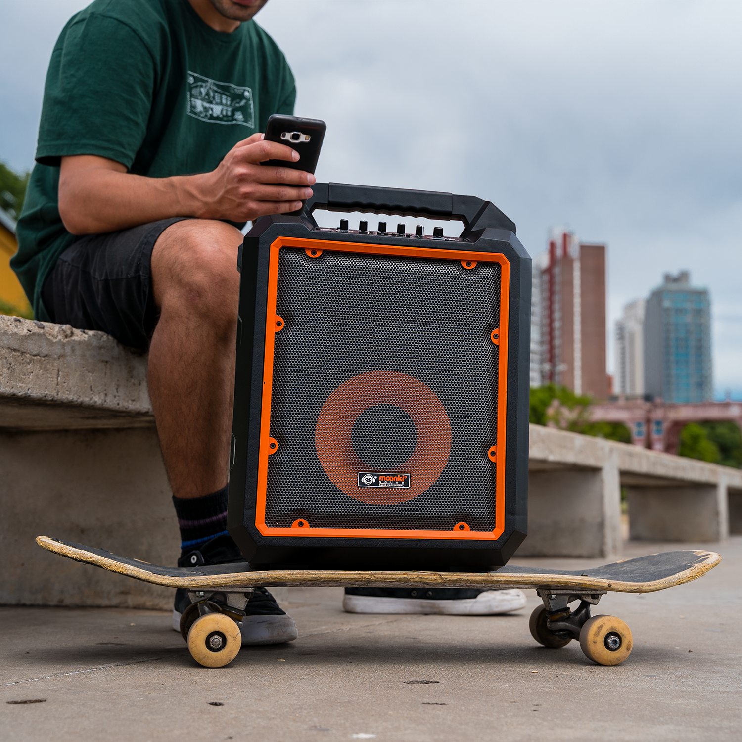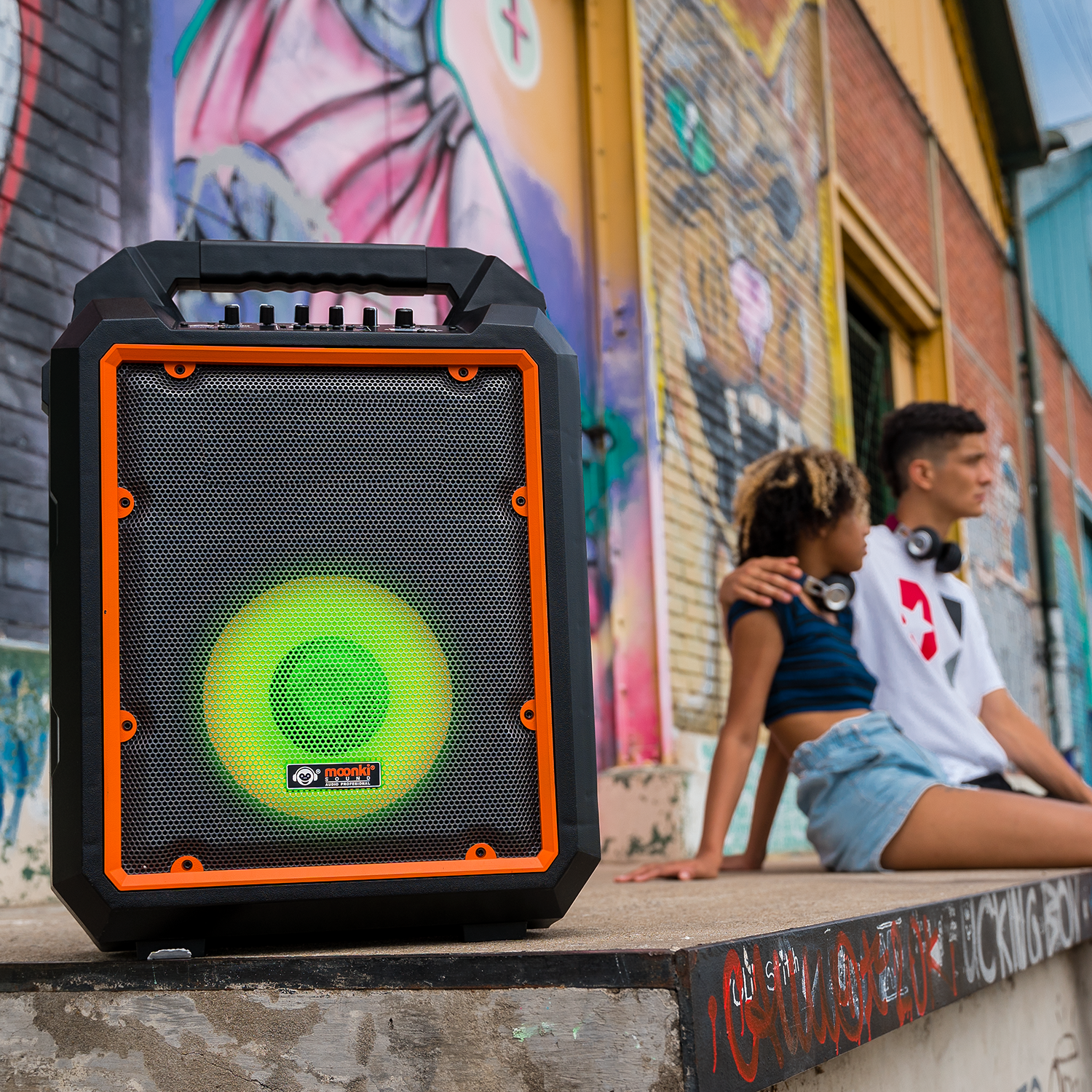 The Moonki Sound TUENT is a two-way active speaker capable of delivering true stereo sound with wireless Bluetooth connectivity. Its long, high-quality playback times are possible thanks to its power, amplifier plate, and high-capacity gel batteries. It also provides great ambiance through its LED light effects and, most importantly, offers a pleasant moment of relaxation to listen, sing karaoke, and share your music your way.
