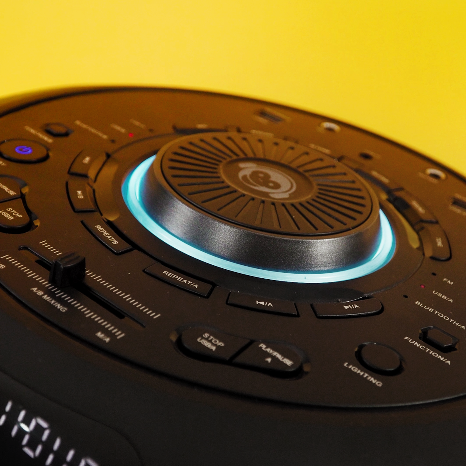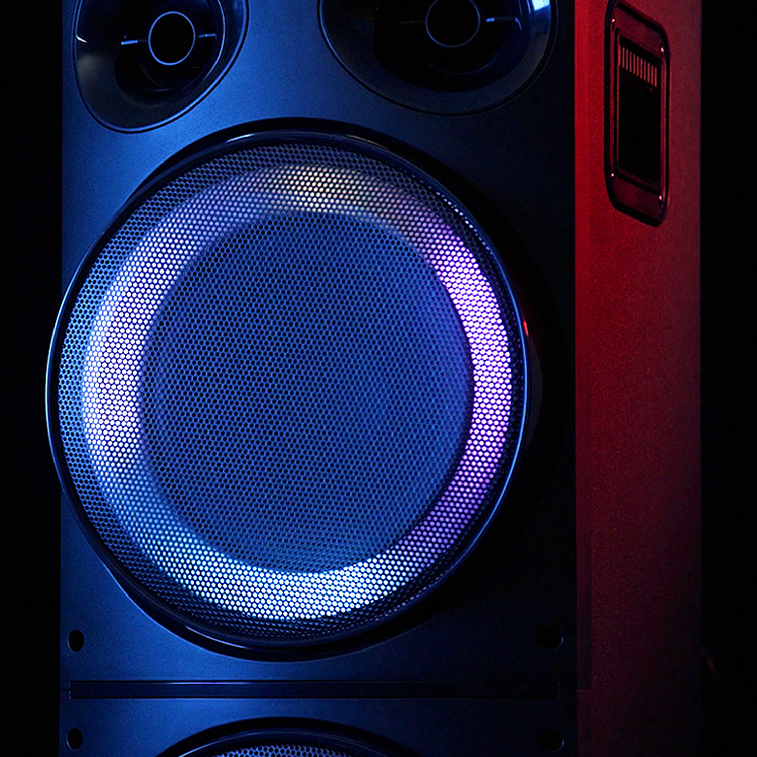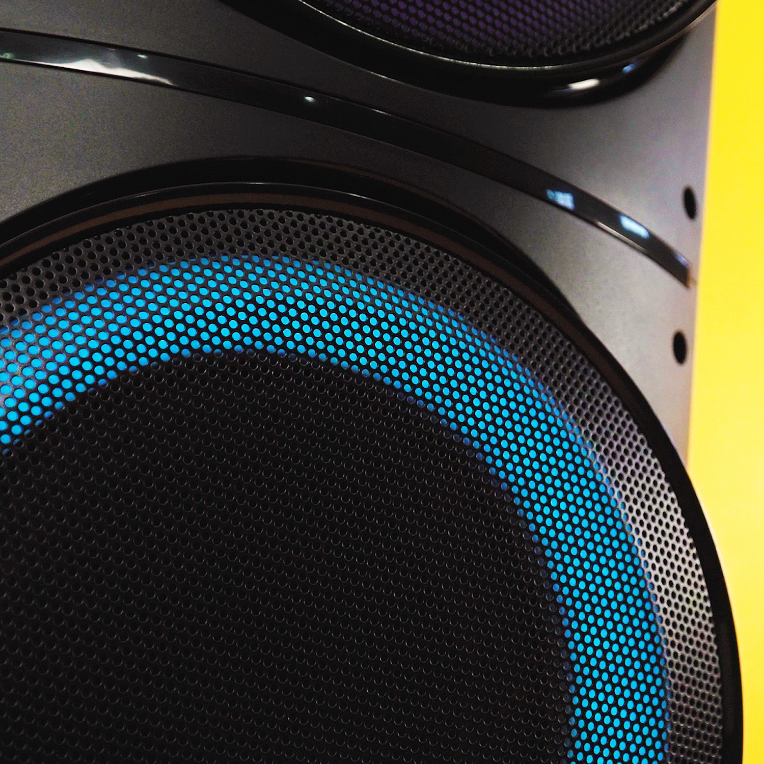 Its dual woofers feature LED light rings with adjustable dynamic effects that you can change anytime from the control panel located on top. Anything else?