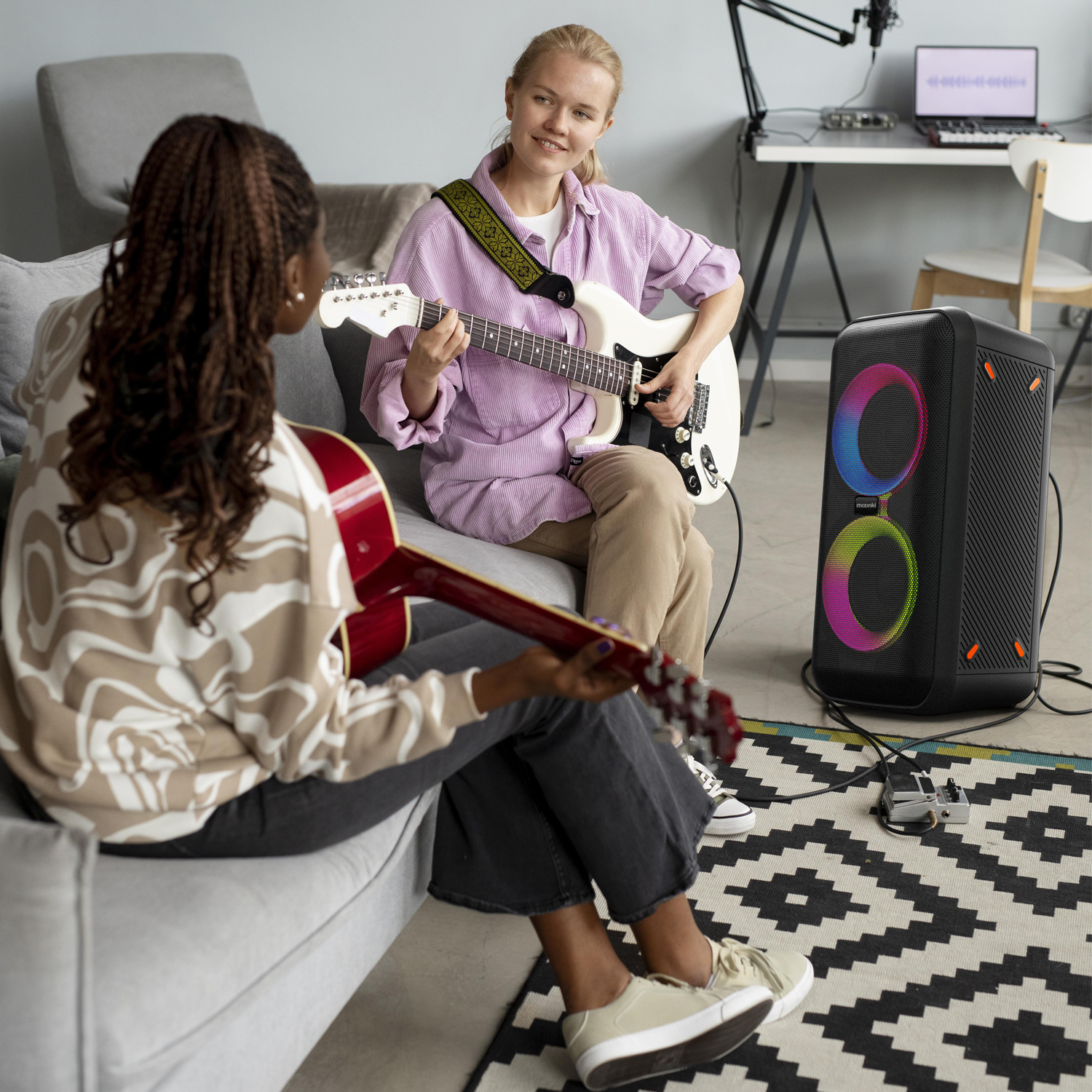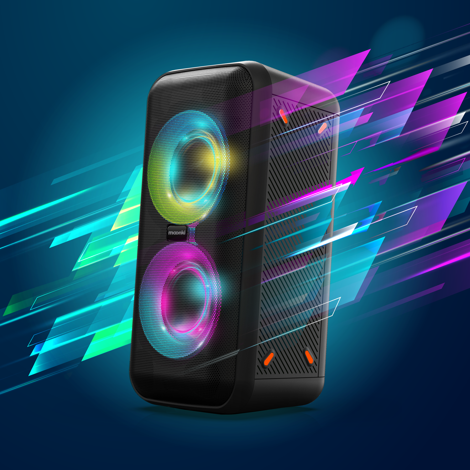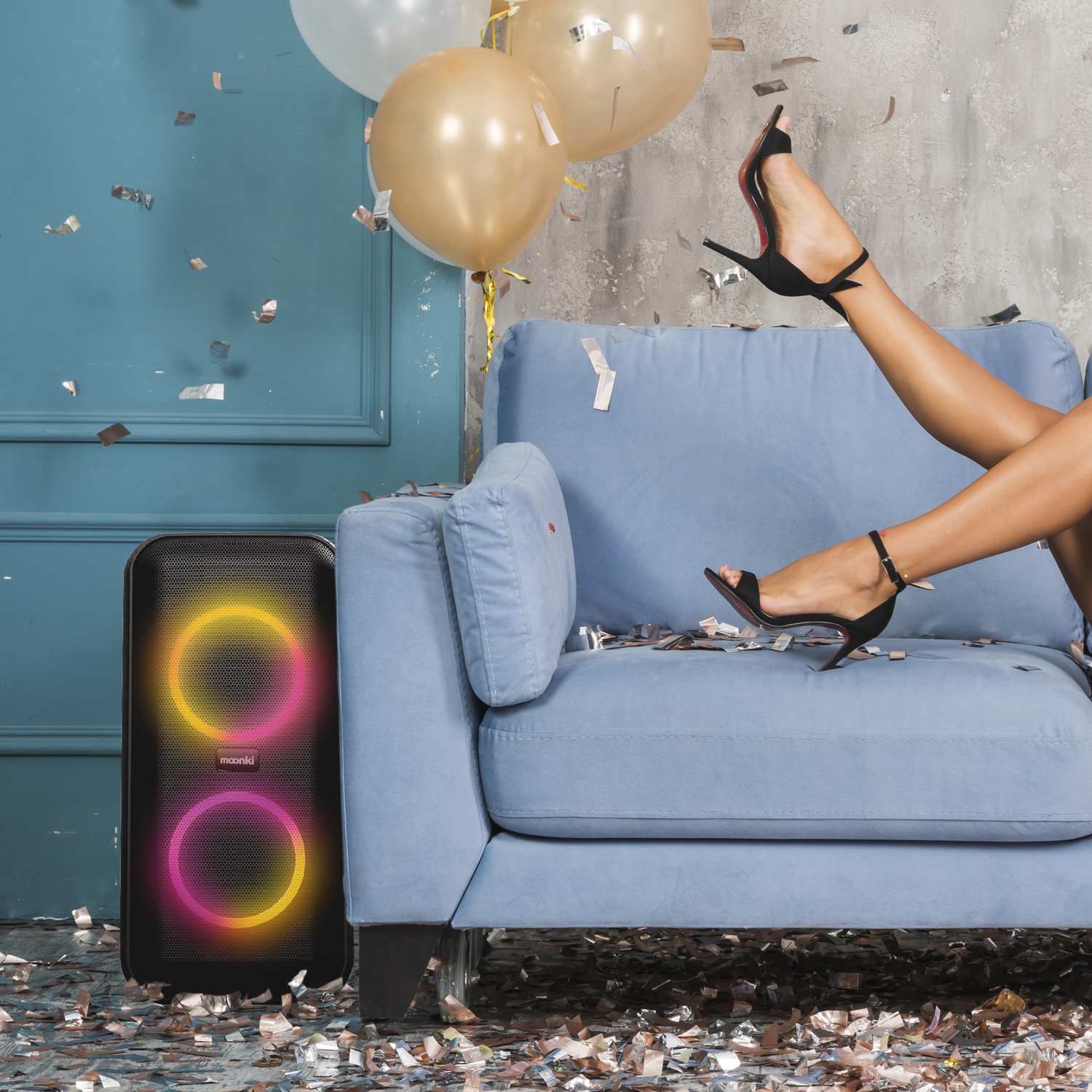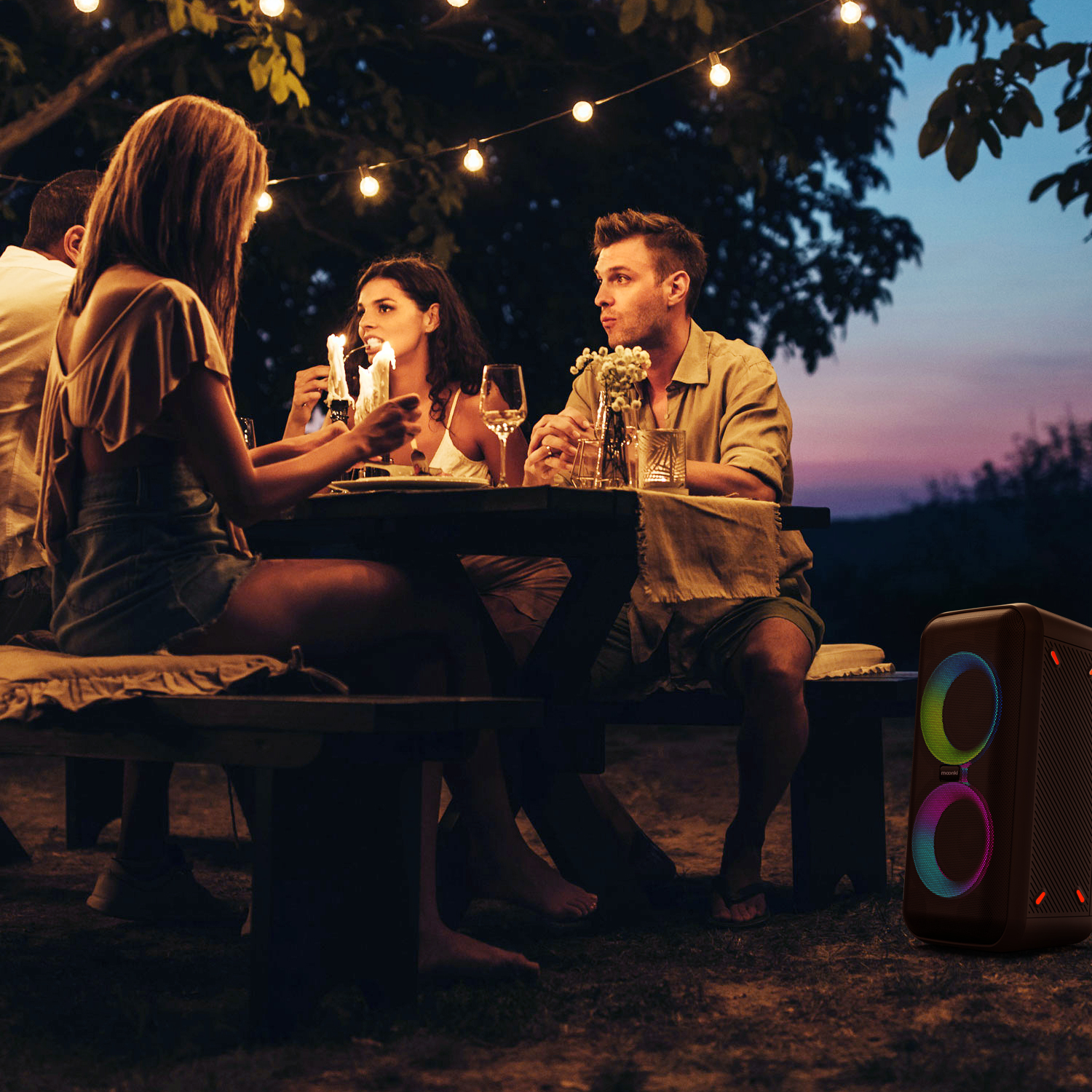 With its refreshed modern aesthetic, this Party Speaker is designed with LED light rings and a variety of adjustable dynamic effects that give it a pleasant, harmonious look, making it a decorative item compatible with any space and capable of brightening any gathering.