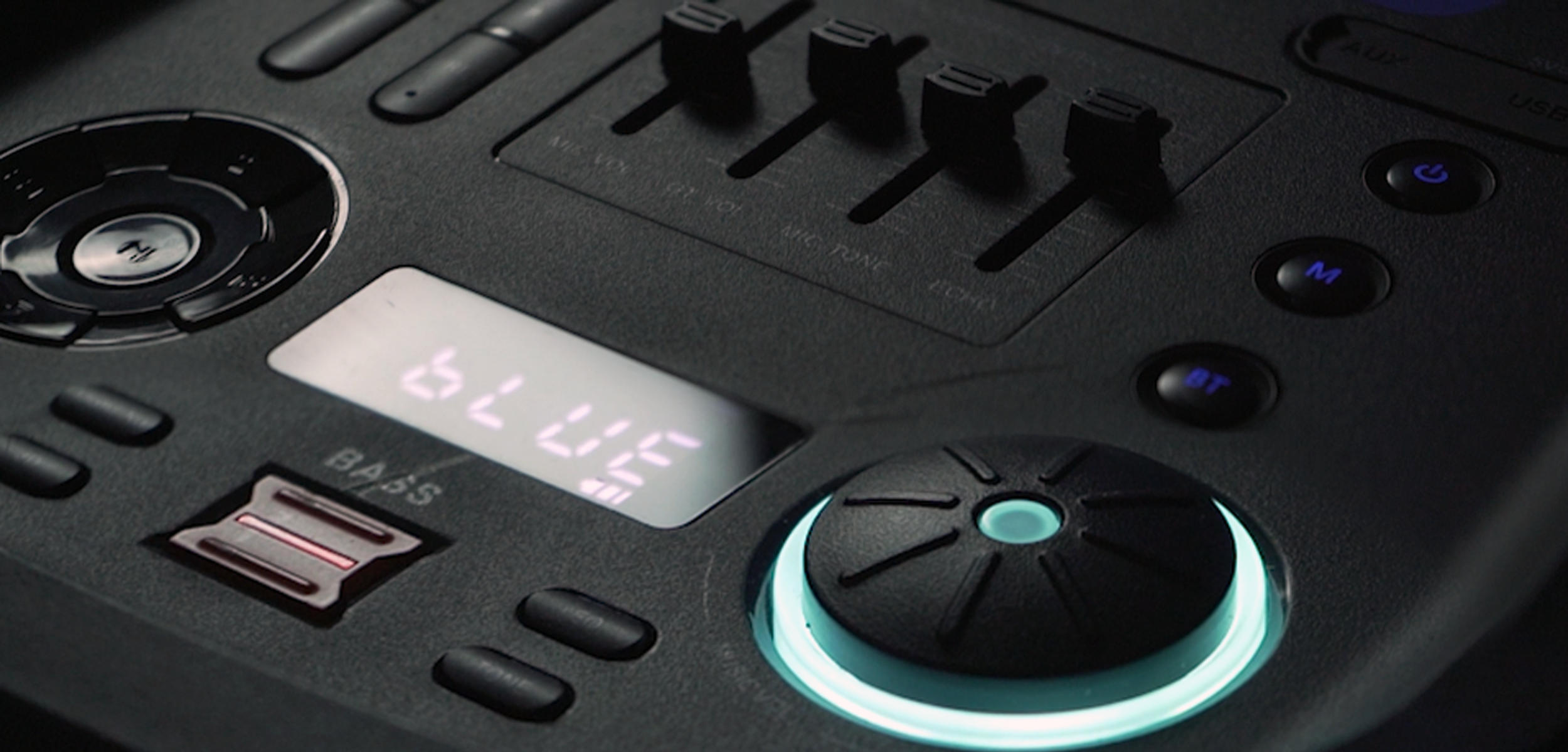 Following these are the bass and equalizer controllers, lights and tones, along with the volume adjustment wheel and LED screen.