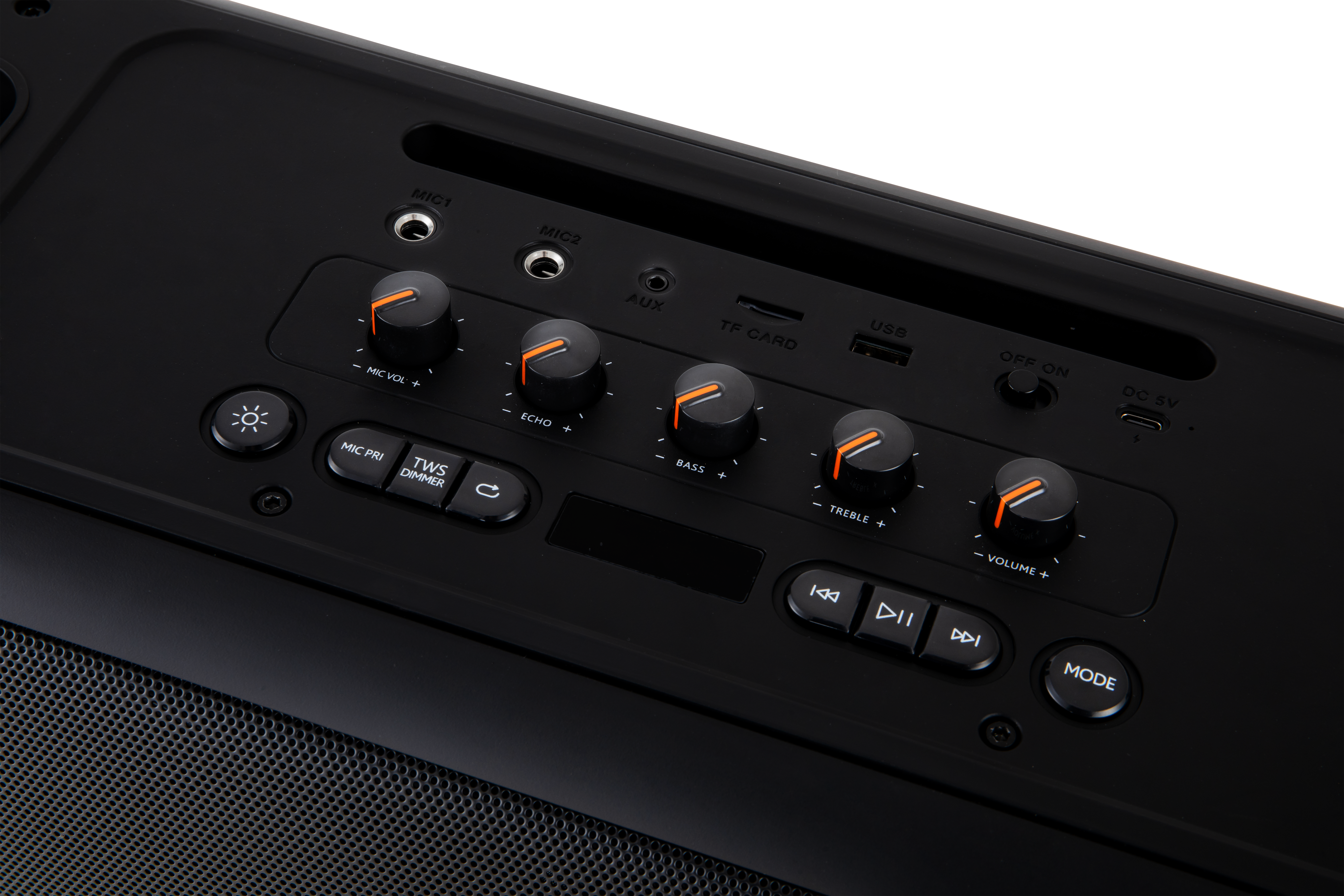With a woofer featuring LED lighting that combines style and functionality. Its minimalist design fits any environment, while the wireless microphone and carrying strap let you take the party wherever you want.