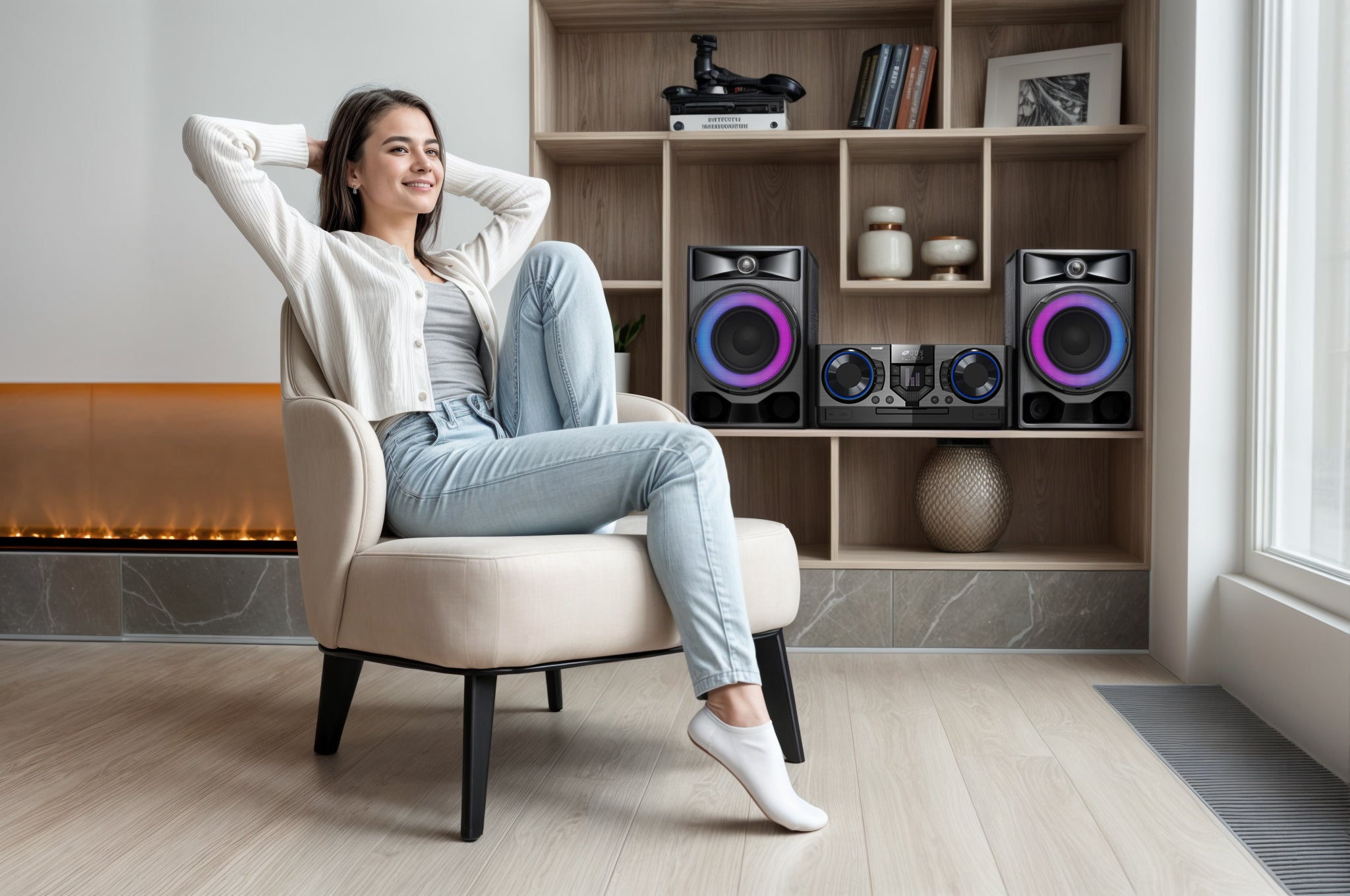 But this system doesn’t just stand out for its outstanding sound quality. It also features dynamic LED lighting effects that sync with the beat of the music, creating an immersive atmosphere perfect for parties, gatherings, or simply enjoying a more engaging experience at home. Its sleek and modern design fits seamlessly into any space, from a living room to a studio or entertainment area.