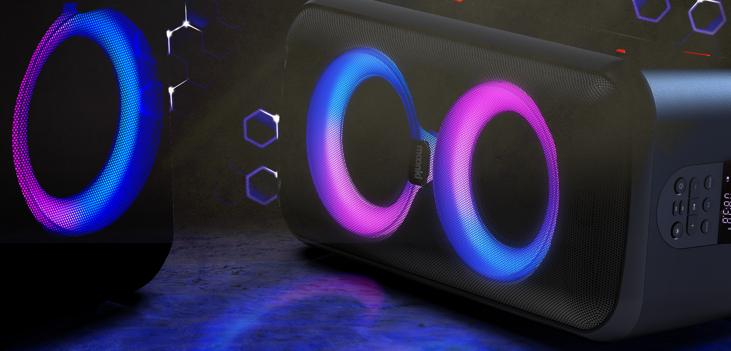 Its modern LED screen displays and allows you to adjust its functions. Additionally, it features LED light rings on the woofers with a variety of dynamic effects.